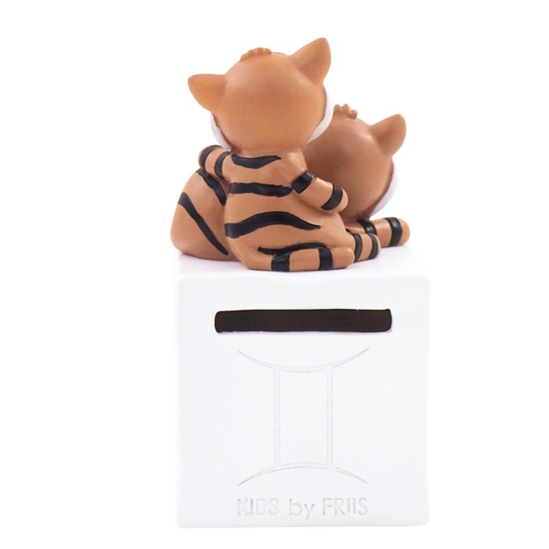 Stjernetegn med tvillingerne i 100 % polyresin. Sparebøssen er med sjov figur af 2 twillinger i top og bagpå er der indgraverede et tvillingerne tegn samt logo Kids By Friis. Forsiden er der lavet en sød tekst der passer ind til en hver tvillingerne. Den måler 6 x 6 x 13 cm og kan lasergraveres med din personlige tekst på siden. Her kan der ca være 50 tegn fordelt på 4 linjer. Alle vores skrifttyper kan anvendes og sparebøssen leveres i æske. så den er klar som gave.
