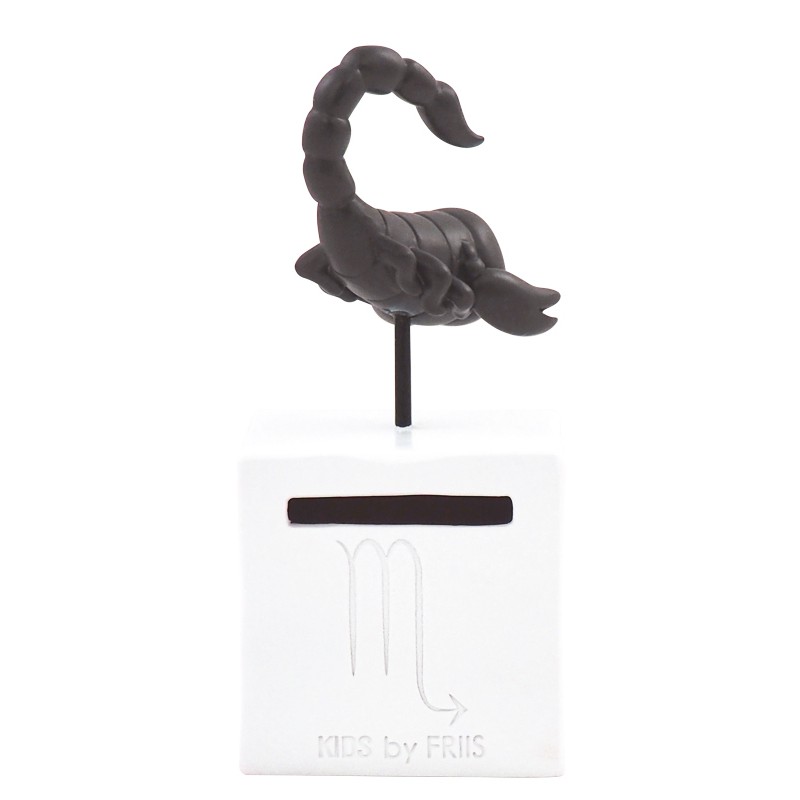 Stjernetegn med Skorpion i 100 % polyresin. Sparebøssen er med sjov figur af vædder i top og bagpå er der indgraverede et vædder tegn samt logo Kids By Friss. Forsiden er der lavet en sød tekst der passer ind til en hver vædder. Den måler 6 x 6 x 13 cm og kan lasergraveres med din personlige tekst på siden. Her kan der ca være 50 tegn fordelt på 4 linjer. Alle vores skrifttyper kan anvendes og sparebøssen leveres i æske. så den er klar som gave.