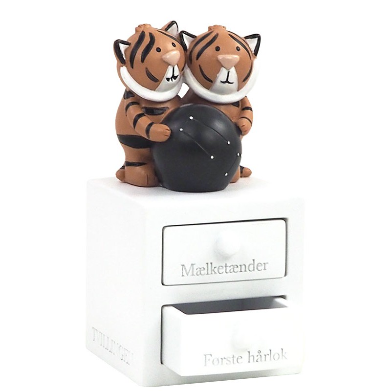 De fine små mælketænder og den første hårlok er altid noget helt særligt, et dejligt minde om dit lille barn og en dejlig tid.De fine tandæsker fra Kids by Friis med stjernetegn har 2 skuffer, 1 til tænder og 1 til hårlok. En rigtig fin måde at gemme begge dele på som et evigt minde. Tand / hår æsken kan lasergraveres med personlig tekst på siden, Her kan det været et navn og evt en dato. Teksten bliver brændt ned i materialet og vil fremstå i let sort farve. Her kan der ca være 50 tegn og alle vores skrifttyper kan anvendes. Hvert stjernetegn som sidder oven på æsken har også en planet med stjernebillede som lyser i mørket. Her er det Tvilling. Kids by Friis tandæskerne er produceret i polyresin, et sten-baserede materiale. De er dansk designet og håndmalede, derfor er hver enkel æske helt unik. Den leveres i æske, så den er klar som gave.