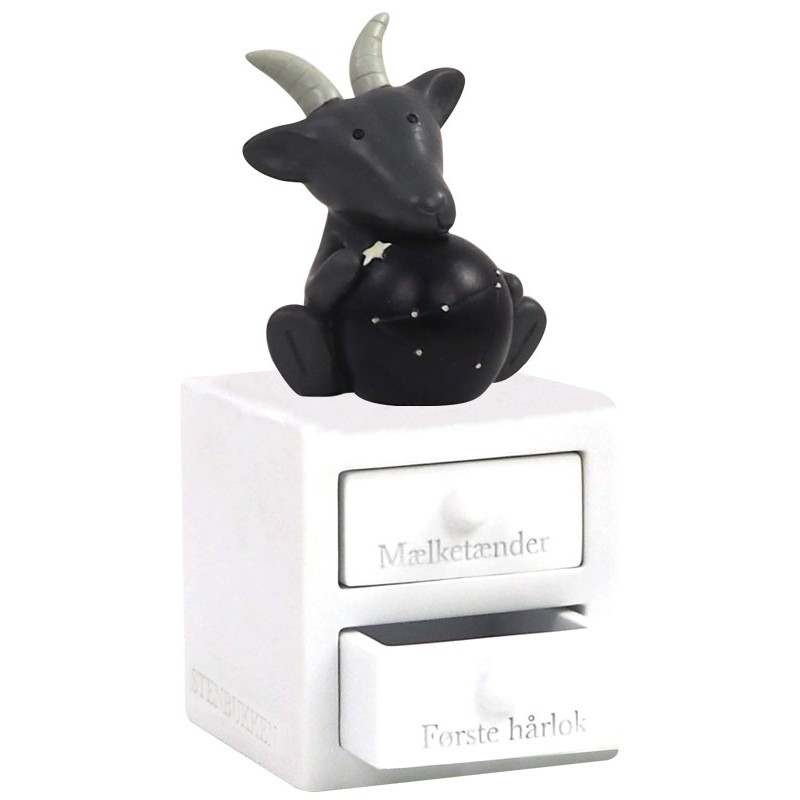 De fine små mælketænder og den første hårlok er altid noget helt særligt, et dejligt minde om dit lille barn og en dejlig tid.De fine tandæsker fra Kids by Friis med stjernetegn har 2 skuffer, 1 til tænder og 1 til hårlok. En rigtig fin måde at gemme begge dele på som et evigt minde. Tand / hår æsken kan lasergraveres med personlig tekst på siden, Her kan det været et navn og evt en dato. Teksten bliver brændt ned i materialet og vil fremstå i let sort farve. Her kan der ca være 50 tegn og alle vores skrifttyper kan anvendes. Hvert stjernetegn som sidder oven på æsken har også en planet med stjernebillede som lyser i mørket. Her er det Stenbukken. Kids by Friis tandæskerne er produceret i polyresin, et sten-baserede materiale. De er dansk designet og håndmalede, derfor er hver enkel æske helt unik. Den leveres i æske, så den er klar som gave.