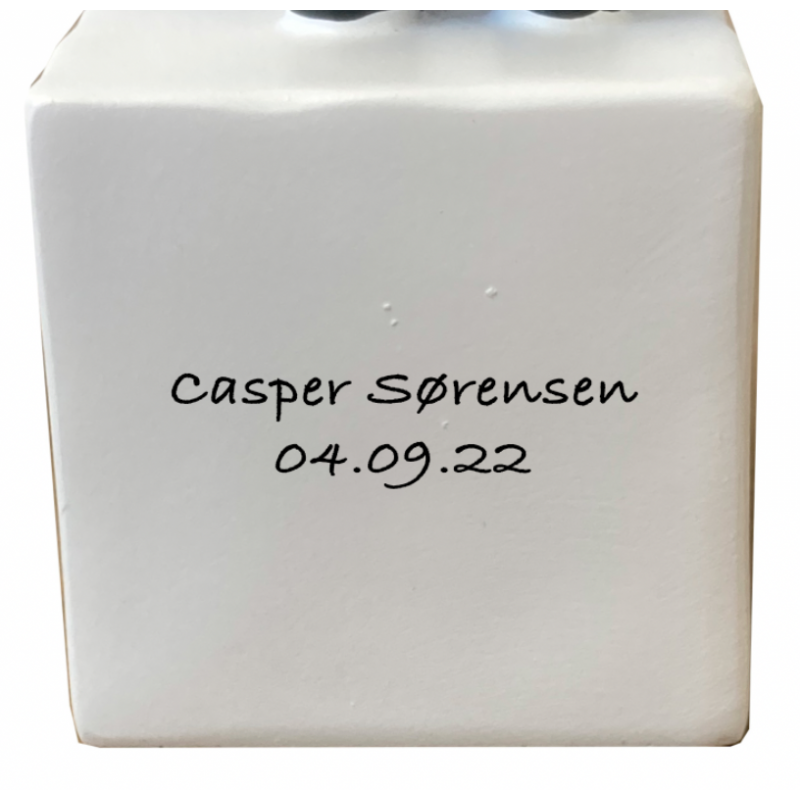 Den er lavet i polyresin. Den måler 6 x 6 x 12 cm og kan lasergraveres med din personlige tekst på siden. Her kan der ca være 50 tegn fordelt på 4 linjer. Alle vores skrifttyper kan anvendes og sparebøssen leveres i æske. så den er klar som gave.