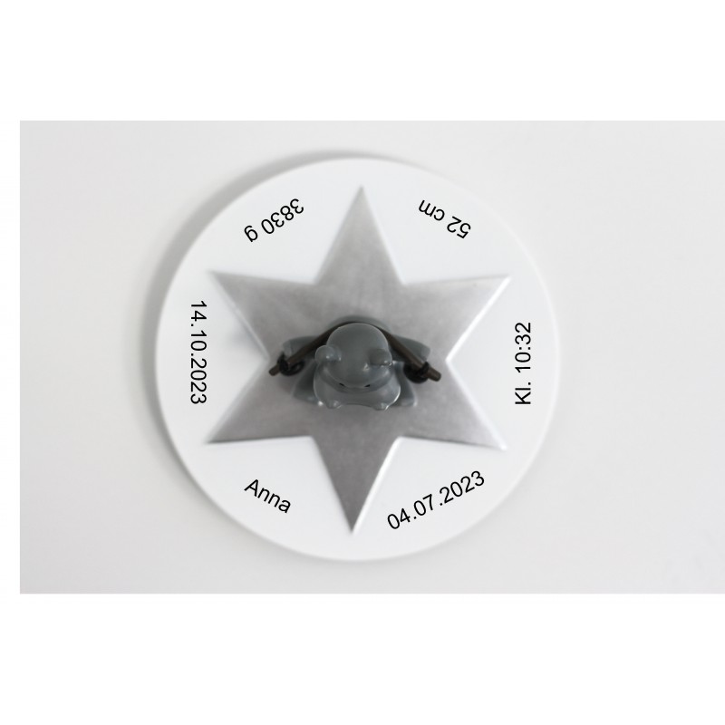 Låget kan graveres mellem stjernespidserne med følgende: navn, fødselsdagsdato, fødselstidspunkt, vægt, længde og dåbsdato. Ønsker du mindre graveret, er det også muligt. Skriv blot den tekst i Graveringsfelterne, som du ønsker. Teksten bliver brændt ned i materialet og vil fremstå i let sort farve.