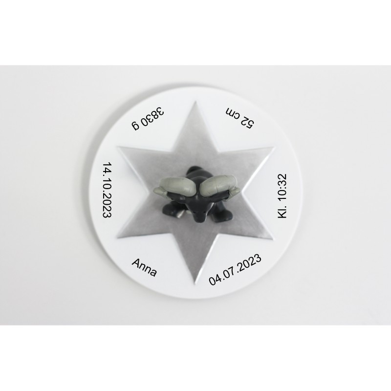 Låget kan graveres mellem stjernespidserne med følgende: navn, fødselsdagsdato, fødselstidspunkt, vægt, længde og dåbsdato. Ønsker du mindre graveret, er det også muligt. Skriv blot den tekst i Graveringsfelterne, som du ønsker. Teksten bliver brændt ned i materialet og vil fremstå i let sort farve.