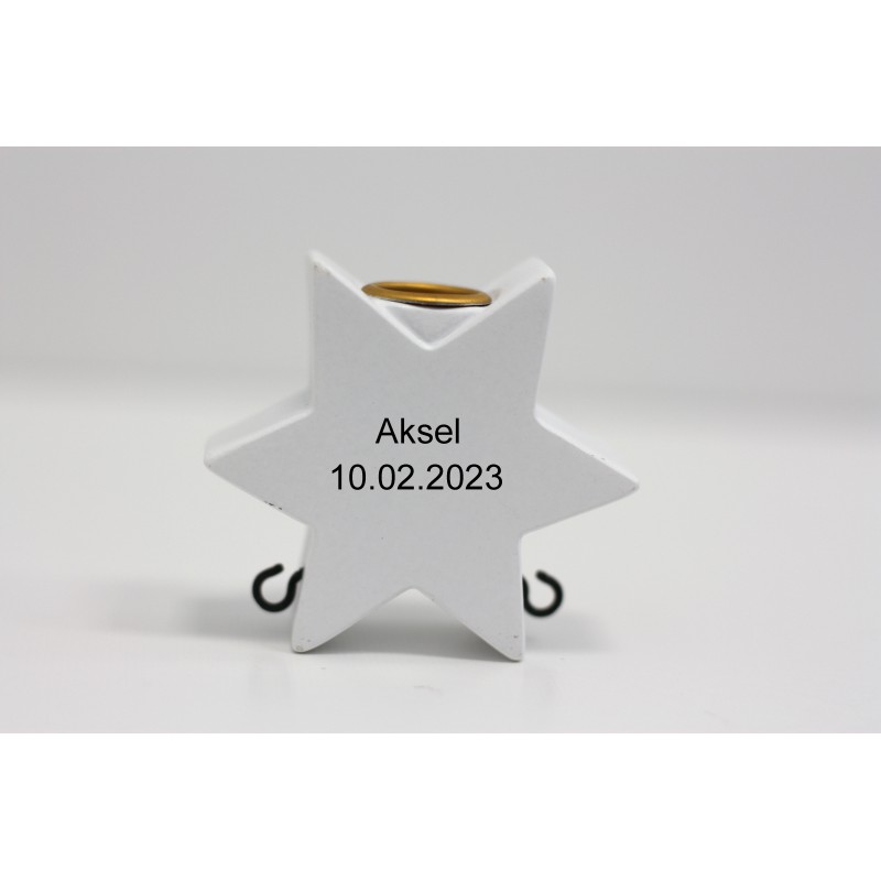 På lokomotivet står stjernetegnets navn. De to små stjerne på lokomotivet er selvlysende. Til hvert stjernetegn hører en planet, og denne følger efter lokomotivet. Der står skrevet på planeten, hvilken planet det drejer sig om. På stjernen kan du f.eks. få graveret barnets fødselsdag. Skriv teksten, som du ønskeret graveret, i Graveringsfelterne. Teksten bliver brændt ind i materialet og vil fremstå i let sort farve.