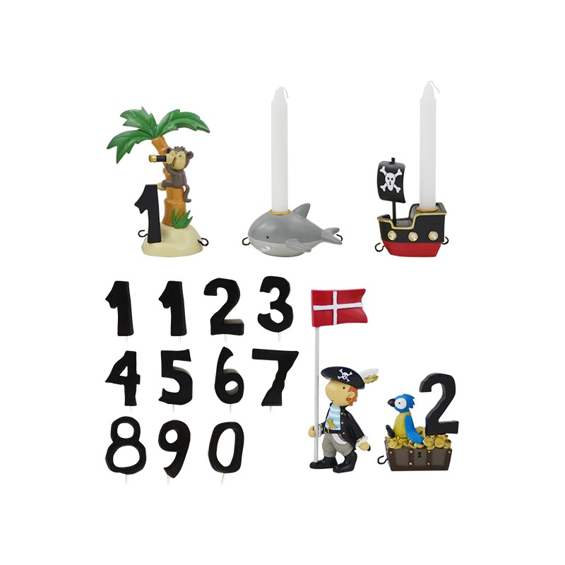 tlf. 20 33 76 60Fødselsdagstoget med Pirater fra Kids By Friis er et festligt fødselsdagstog med 5 dele samt 11 tal og 2 flag inkluderet. I 2 af delene (skibet og hajen) kan der sættes et lille lys som gør fødselsdagstoget mere hyggeligt ved bordet. Der kan også påsættes tal på 2 af delene (aben og papehøjen), så man kan se alderen på fødselaren. Ved køb af fødselsdagstoget er der inkluderet gratis gravering.