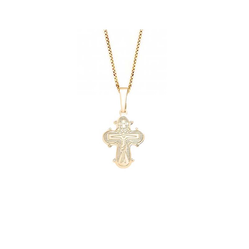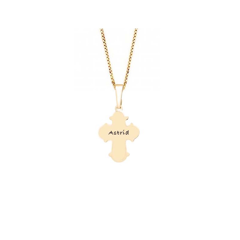 Jesus på korset er afbildet på forsiden, mens bagsiden er blank. Korset er 17,5 mm højt og leveres med kæde. På bagsiden kan der lasergraveres med din egen tekst og vi anbefaler Ariel som skrifttype. Her kan max være 20 tegn og teksten vil fremstå let sort farve.