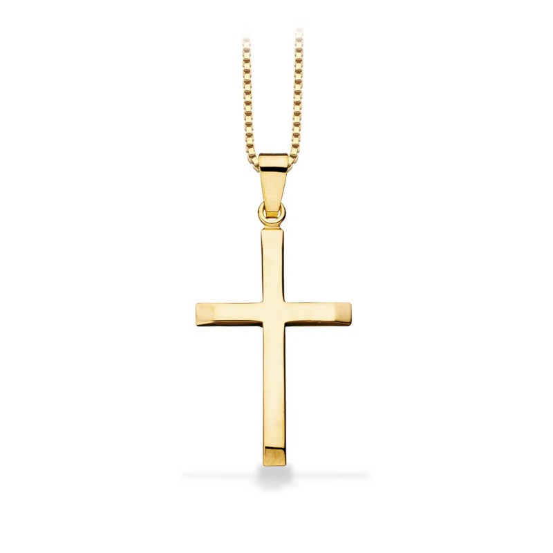 Dette smukke kors i 8 kt. guld er et elegant valg med en forgyldt kæde. Med sin blanke forside og de skæve sider, udstråler korset en stilfuld og moderne æstetik. Korset måler cirka 14 x 22 mm mm og har mulighed for personliggørelse med en vandret lasergravering på forsiden, hvor der kan være op til 10 tegn i sort skrift. Smykket leveres med en 42 cm forgyldt kæde og præsenteres i en flot æske, klar til at give som gave til en særlig person.