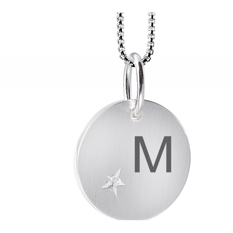 Rund mat Lovetags med lille fin diamant i hjørnet. Smykke vedhænget måler ca 15 mm og leveres med sølv kæde. Her kan du få graverede din egen tekst på forsiden. Teksten vil blive lasergraverede og fremstå i let sort farve.Her kan der ca være 10 tegn og alle vores skrifttyper kan anvendes på dette smykke. Lovetag vedhænget leveres med kæde og i fin æske, så det er klar til at give som gave.