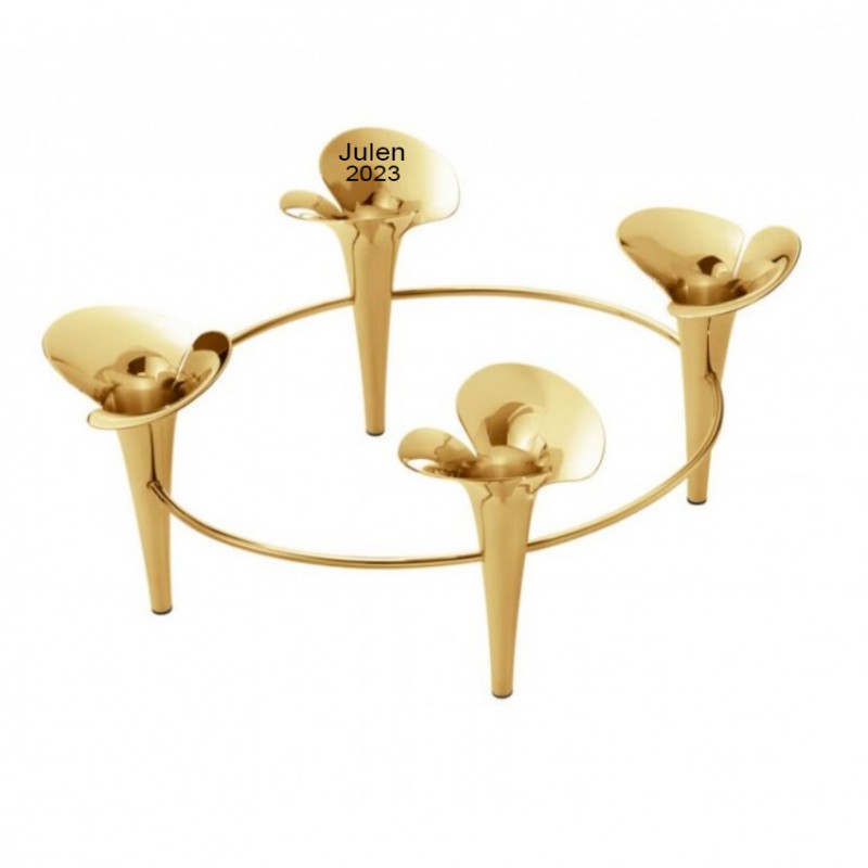 tlf. 20 33 76 60Lysestagen i rforgyldt stål bærer de karakteristiske designelementer fra Bloom kollektionen, der bringer skønheden fra naturen ind i hjemmet. Georg Jensen nye stage som både kan bruges som adventsstage eller til pynt på bordet. En meget stilfuld lysestage til hjemmet. Den har 4 fine " blomster " som går igen i alle Bloom collection. Her kan du lasergraverede en lille tekst i et blad, som kan læses når den står på bordet. Teksten vil blive let sort og her kan cosivia være en godt valg som skrifttype. Der kan ca være 10 tegn på bladet. Måler: H: 150 mm / 5,91 tommer. B: 340 mm. og leveres i fin æske, så den er klar som gave.