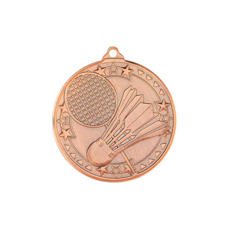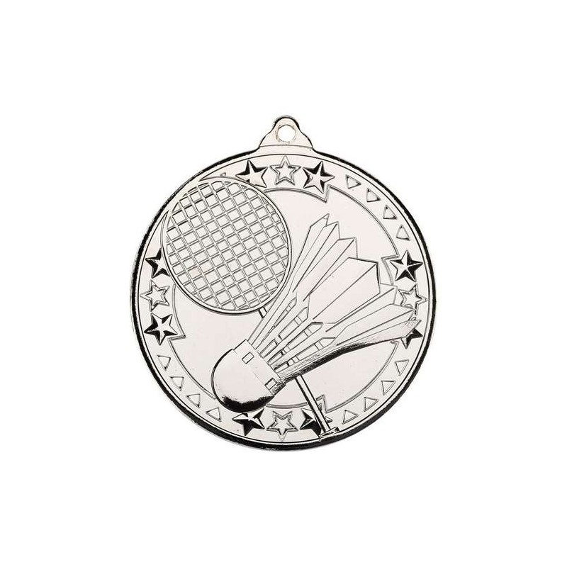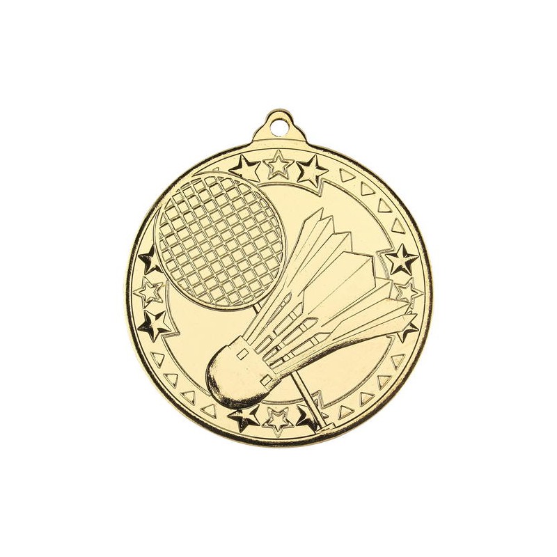 Medalje med badminton på forside. Bag på medalje kan der laser graveres en tekst i flere linjer. Medaljen måler 50 mm i diameter og leveres med valgfrit bånd. Medaljen findes i 3 forskellige farver guld, sølv eller bronze og kan bruge til mindre som større stævner.