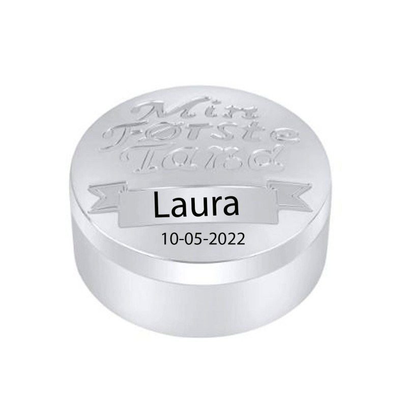 Min første tand æske til opbevaring af barnets mælketand kan graveres med navn på låget Min første tand æsken er i krom og vi anbefaler