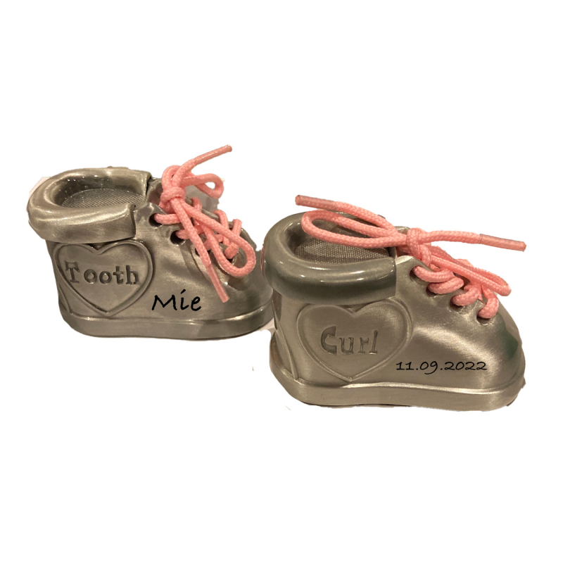 Små søde sko æske i fortinnet look. Her er det mulighed for personlig lasergravering af begge sko og her kan det været et navn samt en dato på hvornår man har tabt den først tand. Teksten vil fremstå i let sort farve og vi anbefaler Ariel som skrifttype. Her kan der ca være 15 tegn på hver sko. Der leveres både lyserød samt lyseblå snørbånd med, som let selv kan skiftes. De små æsker måler 35 x 65 mm og leveres samlede i en æske.