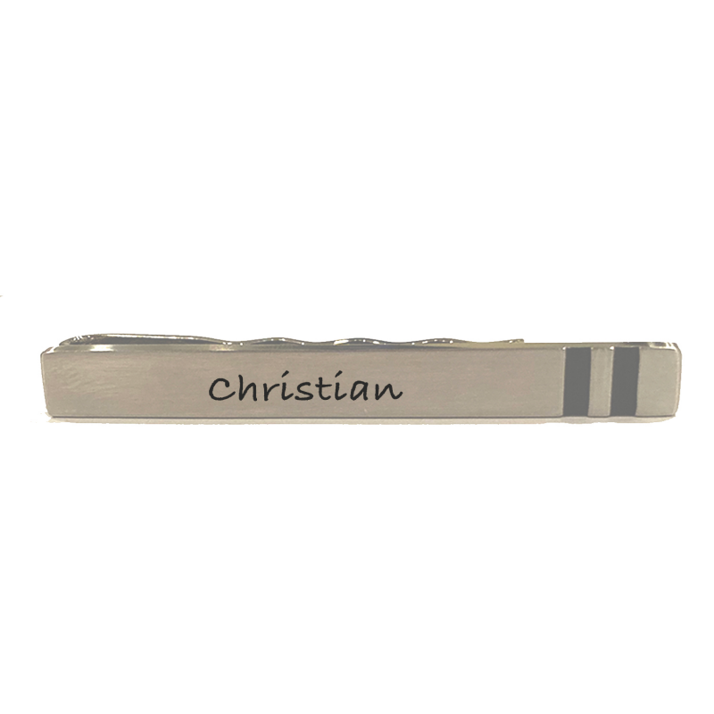 Slipsenålen måler ca 60 x 7 mm og kan indgraveres med personlig tekst. Teksten vil blive lasergraverede og fremstå i let sort farve. Her kan alle skrifttyper anvendes, dog max 20 tegn. En flot slipsenål, hvor der findes matchene manchetknapper til.