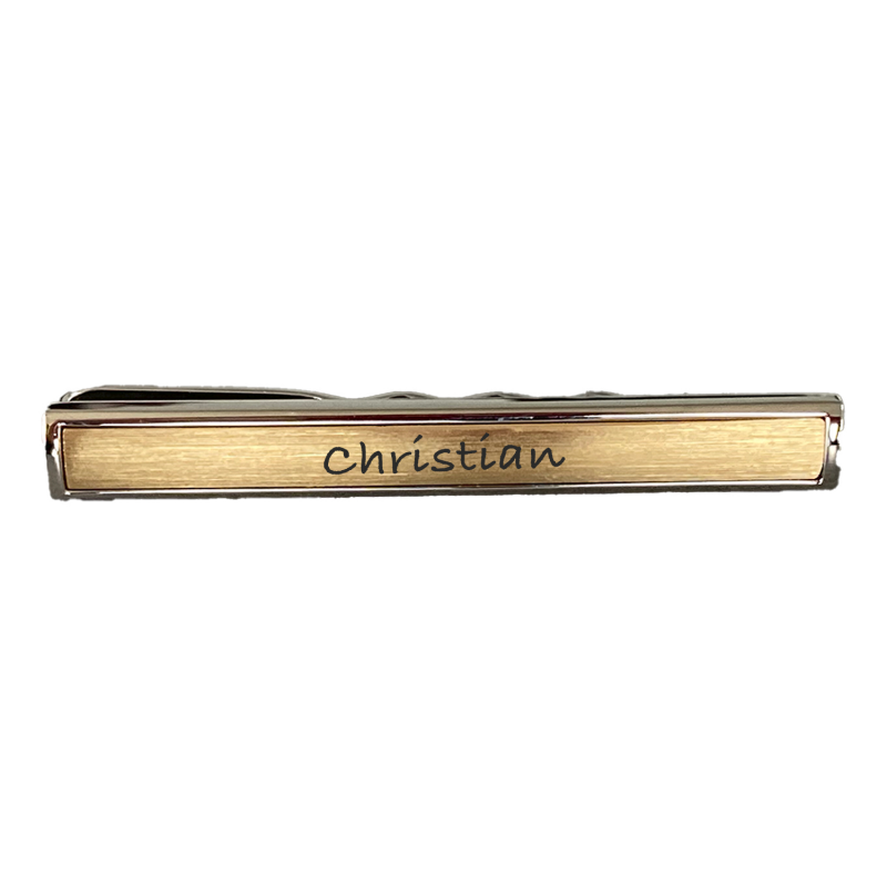 Slipsenålen måler ca 65 x 8 mm. Den kan lasergraveres med din egen tekst i midt og teksten vil fremstå i let sort farve. Vi anbefaler ariel på denne slipsenål og max 10 tegn.