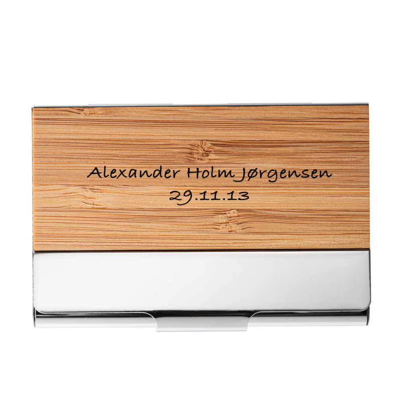 En flot og anderledes kortholder med plads til ca 4 kort eller til dine visitkort. Den måler 46 x 41 x 25 cm og med den flotte træbeklædning, får du her en anderledes kortholder. Her kan vi lasergravere din tekst ned i træet og dette vil fremstå i let sort farve. Her anbefaler vi alle vores skrifttyper. Der kan ca være 50 tegn. Da træet har forskellig farver, kan man forvente at farven i graveringen kan være lidt ujævn i farven. Den leveres i æske, så den er klar som gave.