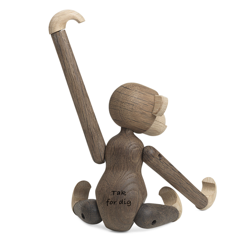 Teksten vil blive brændt ned i træet og vil fremstå i let sort farve. Her anbefaler vi Ariel som skrifttype og ca 25 tegn fordelt på 2 linjer. Teksten vil blive graverede fornede på aben. Aben kan både flytte arm og ben og dreje hovedet, så den kan både hænge eller sidde på en hylde. Den søde abe kan lave mange narrestreger og leveres i original æske, så den er klar til at give som gave.