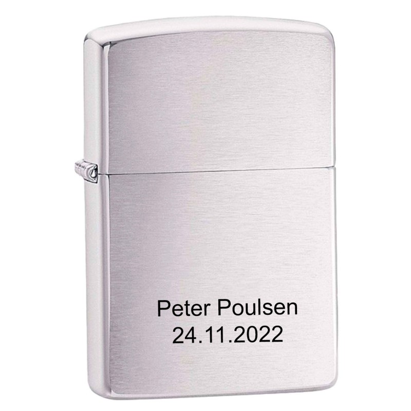Lighteren er helt enkelt og kan bruges som Farsdagsgave, studentergave eller til andre begivenheder. På denne lighter er der mulighed for indgravering på 2 sider med din egen tekst. Teksten vil blive lasergraverede og fremstå i sort farve. Der kan ca være 50 tegn på hver side. Ønskes der et lille motiv kan det nemt tilføjes. Zippo lighteren leveres i original æske samt med Logo Tryk i bund af lighterPå denne lighter er der evighedsgarantiHusk at købe Zippo Benzin til lighteren - da dette ikke er påfylde ved køb.