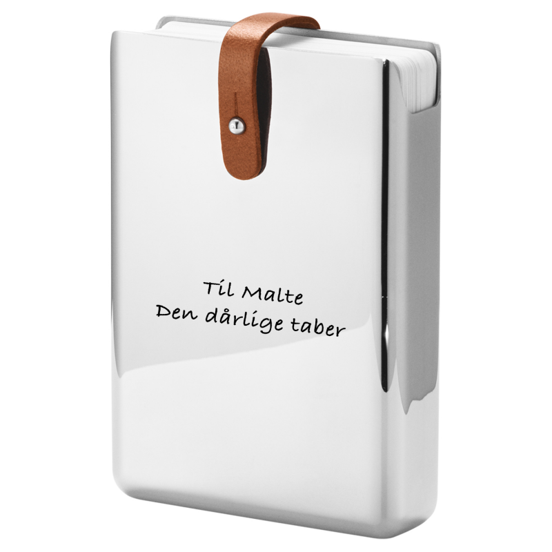 så gør kortspillet til stilfuld luksus med denne beholder i rustfrit stål med læderrem. Med plads til et helt sæt spillekort er æsken også velegnet til indgravering, hvilket gør den til en virkelig personlig gave. Her kan du få lasergraverede en lille tekst eller måske et navn. Teksten vil blive lasergraverede og fremstå i let sort farve. Alle skrifttyper er egnet til dette kortspil og der kan ca. være 50 tegn fordelt på 5 linjer.