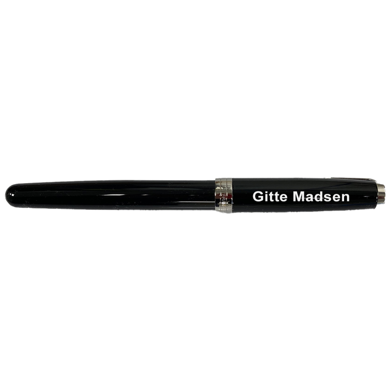 Parker Fyldepen kan lasergraveres med navn eller lille tekst. Her anbefaler vi Ariel som skrifttype og ca 15 tegn. Teksten vil fremstå i let guld farve, som gør det elegant og flot. Prop og hætte er lavet af messing og dækket med dyb, skinnende sort lak. Den tredobbelte ring er lavet af messing og dækket med en nikkel-palladiumlegering. Klemmen er lavet af rustfrit stål og belagt med en nikkel / palladiumlegering. Fremstillet i Frankrig. Cap krone: nikkel og palladium belagt messing. Rustfri stålspids. Udstyret med et stempel.