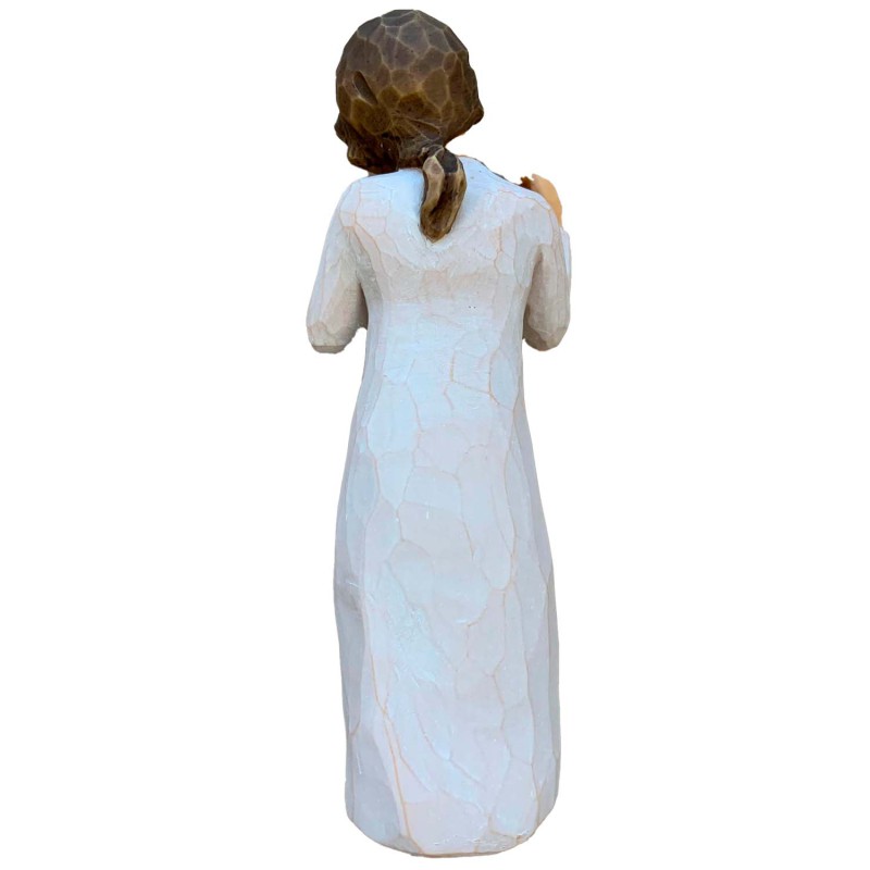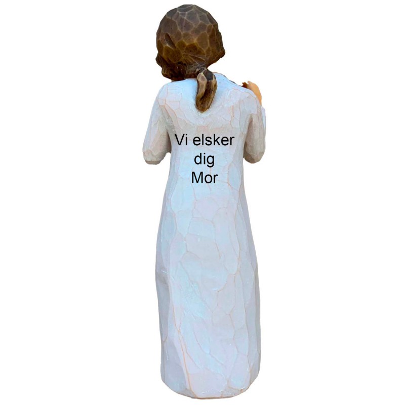 Den måler 13 cm i højden. Her kan du få graverede en lille tekst bagpå, teksten vil fremstå i let brun farve og her kan der ca være 20 tegn fordelt på 3 linjer. Den bliver leverede i orginal æske fra Willow Tree, så den er nem at give som gave til en du elsker.