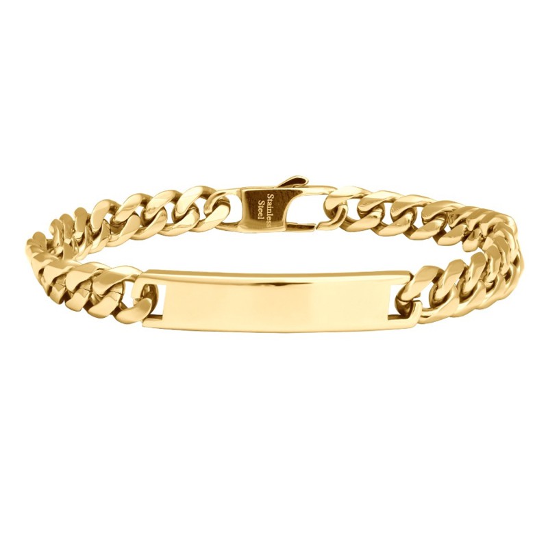 Stål armbåndet er forgyldt og findes i 3 længder 19, 21 og 23 cm. Her kan der lasergraveres på plade og vil fremstå i let sort farve. Vi anbefaler alle skrifttyper, dog max 20 tegn. Da armbåndet er forgyldt, skal man forvente at forgyldningen kan slides af ved daglig brug.