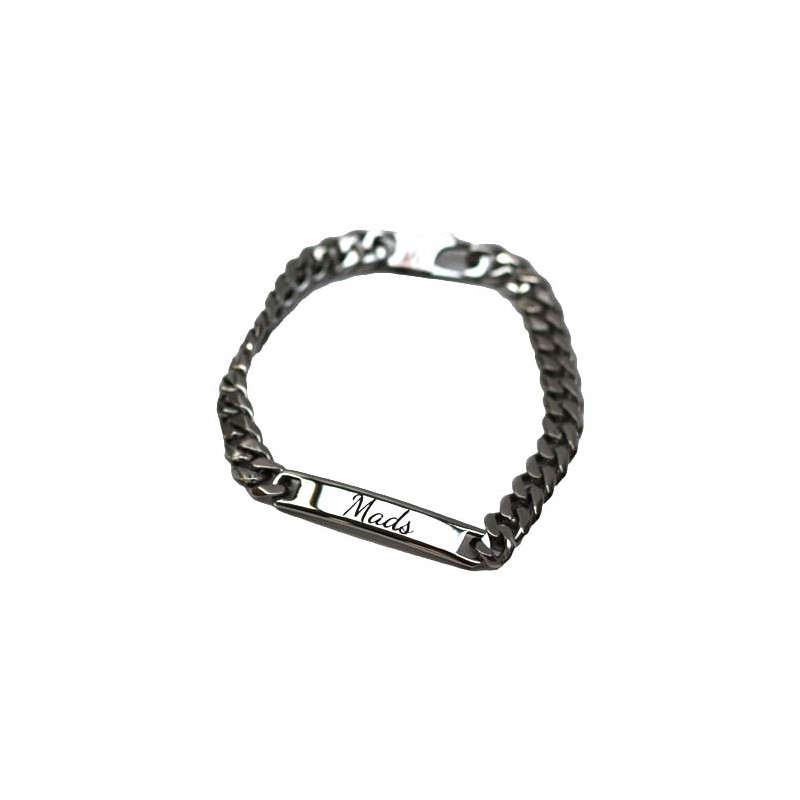Stål armbåndet findes i 3 længder. 19, 21 og 23 cm. Her kan der lasergraveres på plade og vil fremstå i let sort farve. Vi anbefaler alle skrifttyper, dog max 20 tegn. Et flot og lækkert armbånd til manden, der har alt.