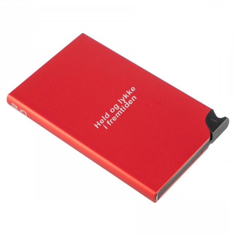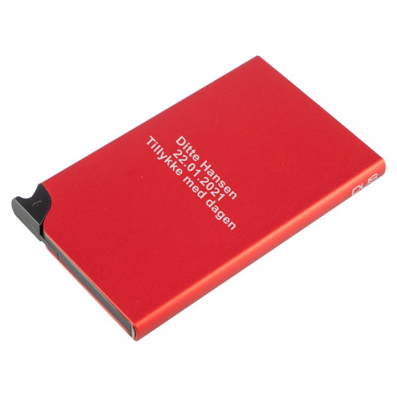 Kortholderen er i rød og måler ca 62 x 100mm. Den kan ca. indeholde 4-6 kort og har en smart pop-up funktion. Her kan du lasergravere din personlige tekst og der kan ca være 50 tegn på hver side af denne kortholder. Alle skrifttyper kan anvendes og teksten vil fremstå i let sølv farve. Kortholderne leveres i æske så den er lige til at give som gave. Perfekte gaveide til for eksempel studenten eller konfirmanden.
