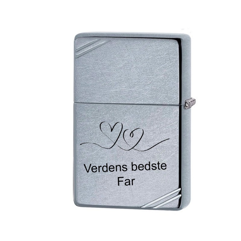Elegant og stilfuld Zippo lighter med små graveringer i hjørner. Zippo lighter kan indgraveres med tekst eller navn og dato og vi anbefaler alle vores skrifttyper på denne lighter. Teksten vil blive lasergraverede og fremstå i let sort farve. Her kan ca være 30 tegn på hver side. Zippo lighteren måler 35 x 55 mm. Denne lighter bliver leveret i original Zippo æske og med Zippo logoi bund. Der er livstidsgaranti på denne lighter. Husk at købe Benzin til lighter - da dette ikke er påfyldt ved køb.