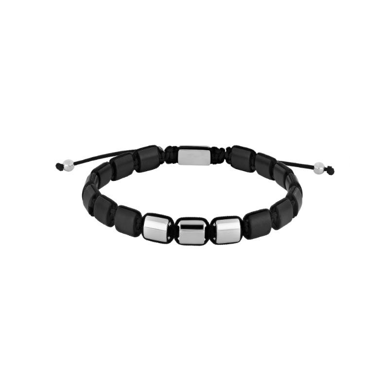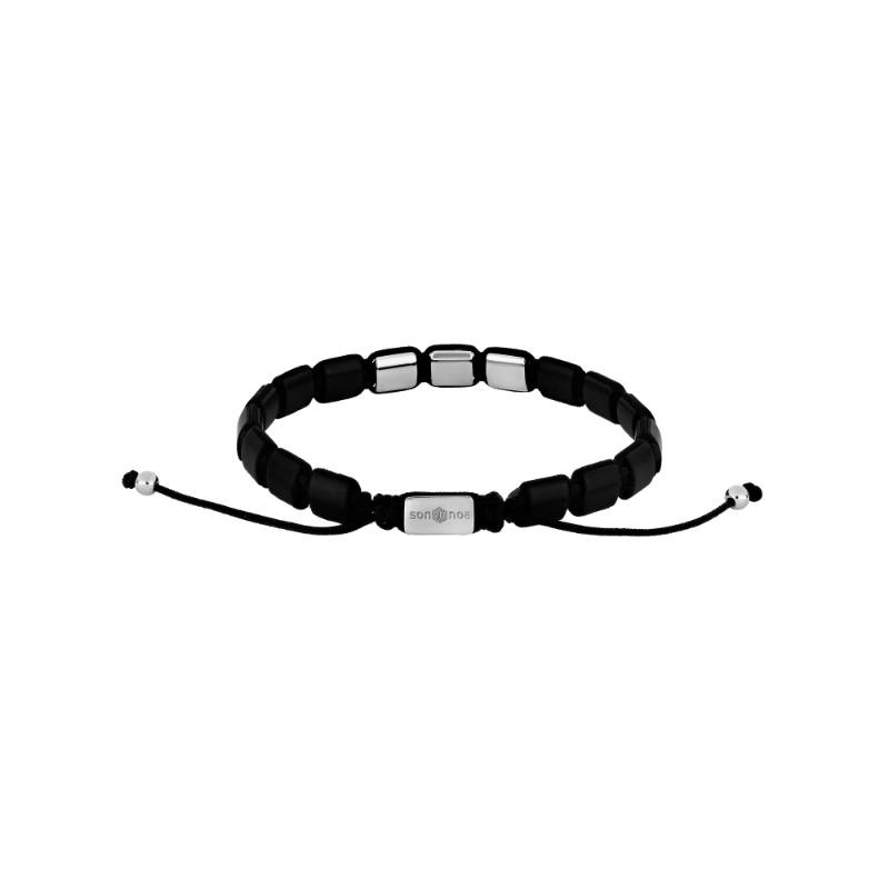 tlf. 20 33 76 60Square armbånd fra Son of Noa er et flot og anderledes armbånd til herre. Herrearmbåndet er med sorte onyx og 3 stål plader foran og et bagved lås. De små firkanter er ca 7,5 mm i højden og armbåndet som kan justeres er i mellem 19 - 25 cm. Det er bundet med nylon snor og har i enden 2 små perler. Her kan du få graverede 3 bogstaver eller måske 2 bogstaver og et lille hjerte, det er helt op til dig. Det er helt sikkert et hit som gave til far eller en du holder af.