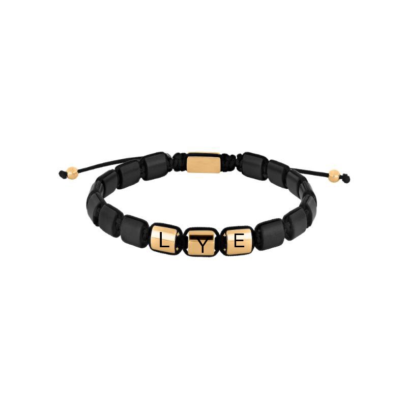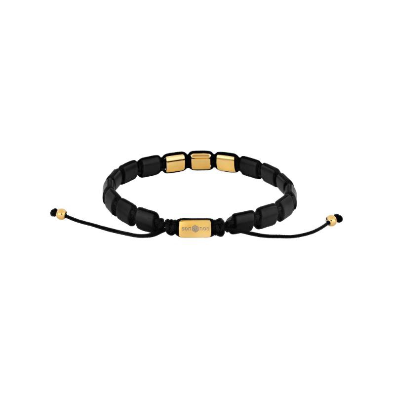 Square armbånd fra Son of Noa er et flot og anderledes armbånd til herre. Herrearmbåndet er med sorte onyx og 3 stål forgyldte plader foran og et bagved lås. De små firkanter er ca 7,5 mm i højden og armbåndet som kan justeres er i mellem 19 - 25 cm. Det er bundet med nylon snor og har i enden 2 små perler. Her kan du få graverede 3 bogstaver eller måske 2 bogstaver og et lille hjerte, det er helt op til dig. Det er helt sikkert et hit som gave til far eller en du holder af.