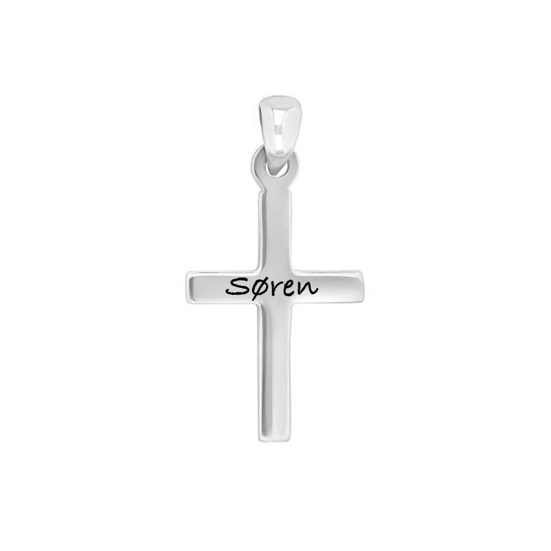 tlf. 20 33 76 60Sølvkors fra Siersbøl, måler 28 x 15 mm, og leveres med en sølvkæde i en æske. Dette smykke er designet til mænd og kan fungere som et flot vedhæng. Sølv korset er massivt og kan lasergravers foran med en lille tekst. Her kan der max være 15 tegn. Teksten vil fremstå i let sort farve. Vi anbefaler Ariel som skrifttype til dette smykke.