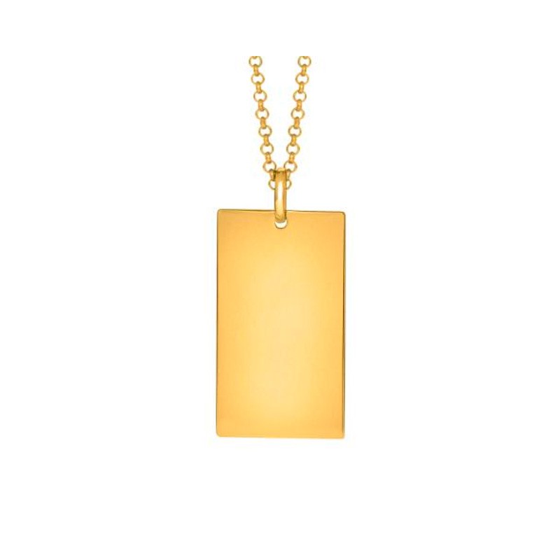 Herre smykket er et flot blank smykke i forgyldt stå , hvor der kan indgraveres en personlig tekst. Smykket måler 17 x 29 mm og der medfølger en 50 cm lang kæde. Her kan der lasergraveres 3 linjer og teksten vil fremstå i let sort farve. Alle vores skrifttyper kan anvendes og er en perfekt gave til manden.