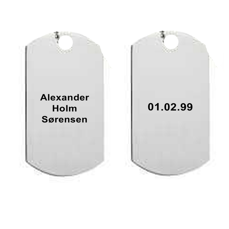 Nøgleringen måler 25 x 40 mm og kan graveres på begge sider med en personlig hilsen eller et godt billede af børnene. Her kan både bruges farve / sort-hvid billeder og vi klipper selv alt baggrund fra til din nøglering bliver flot og unik. Vi anbefaler at vælge billede samt tekst på hver sin side. Her kan din tekst lasergraveres og vil fremstå i let sort farve. Der kan ca være 40 tegn på en side ( uden billede ) Billede vil blive ligeså blive lasergraverede og fremstå flot på denne nøglering. En nøglering der kan holde til daglig brug og som måler 29mm x 50mm x 2mm. Den leveres i fin smykkepose, så den er klar som gave.