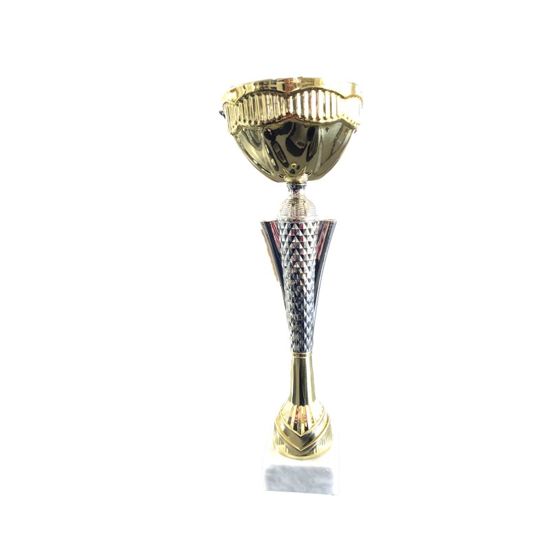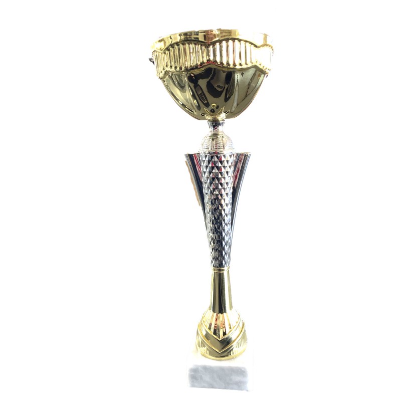 Pokalen er i 3 forskellige højder ca 27, 32 og 36 cm. Der kan på sættes skilt på fod, hvor den ønskede tekst kan graveres. Vi anbefaler skrifttype Ariel. Foden måler ca 6 x 2,5 cm og er i hvid marmor. Denne pokal kan bruges til alle sportsstævner eller andre begivenheder hvor der er en vinder.