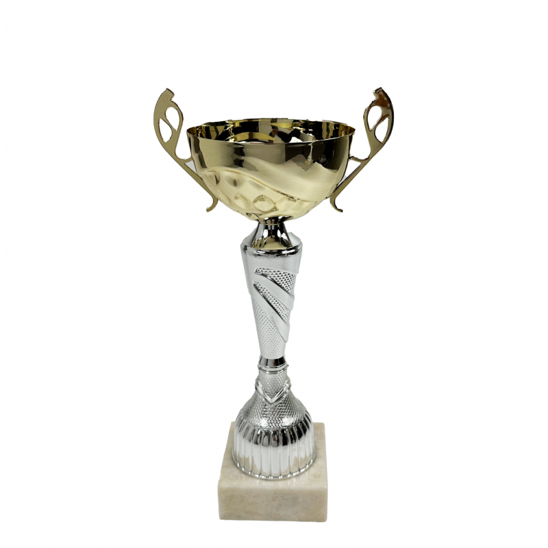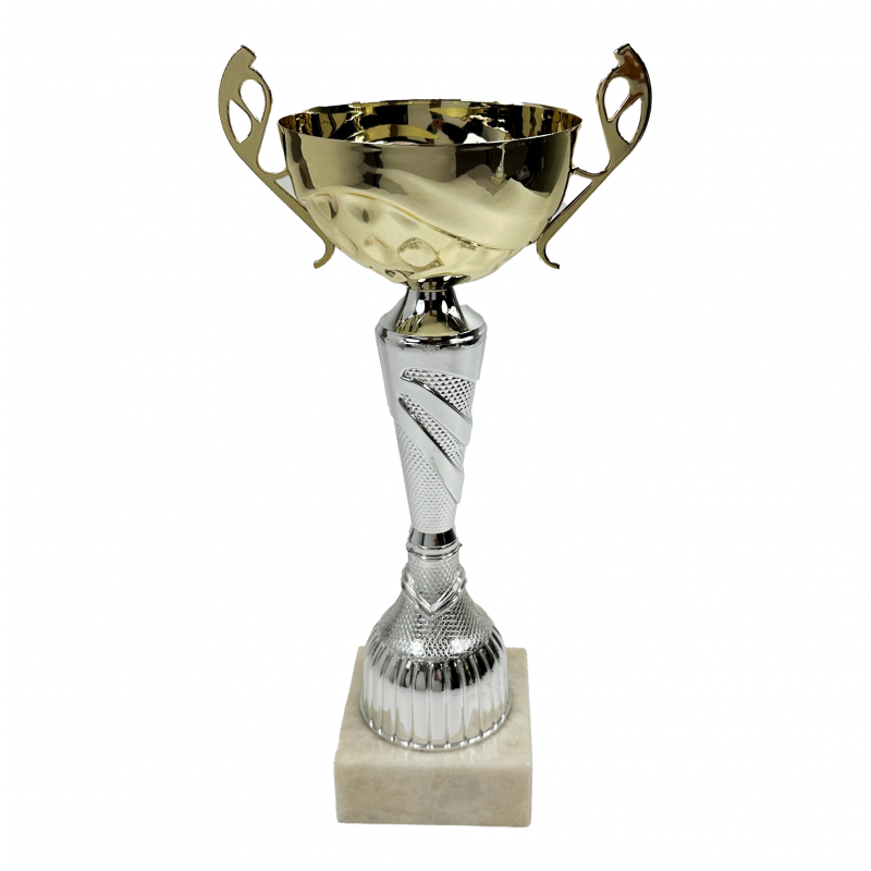 Pokal findes i 2 størrelser, hvor den lille er ca. 28 cm og den store er cirka 32 cm høj. En version af denne pokal findes også med låg og plads til emblem. Denne pokal kan bruges til alle sportsbegivenheder. Med den enkle hvide marmorfod og den forgyldt kop med ” øre” har du her en pokal som kan bruges til alt. Foden er med hvid marmor og måler 8,5 x 3 cm og kan monteres med skilt, hvor der indgraveres din ønskede tekst. Her kan der ca være 40 tegn fordelt på 3 linjer. En virkelig flot pokal til dit næste stævne.