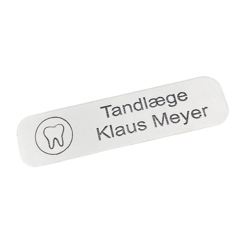 Et stilrent navneskilt med en tegning i siden, perfekt til personlig brug eller som gave. Skiltet måler 80 x 20 mm og leveres med en nål på bagsiden for nem fastgørelse.