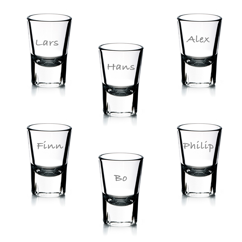 Disse flotte snapseglas fra Rosendahl Grand Cru serien har en god tyngde og en praktisk størrelse og de er derfor velegnede til en kold snaps og andre former for drikke såsom frugtshots. Glassene kan lasergraveres med hver sin tekst eller måske med et logo, hvis det ønskes.Design selv dine glas med en lille tekst på hver glas. Her kan alle vores skrifttyper anvendes og max 15 tegn pr glas. Ønskes der logo på glas, så kontakt os på info@dahlsgravering.dk og vi afgiver gerne et tilbud på dette. Teksten vil fremstå i hvid og vi gør opmærksom på at vi retter din tekst til, så det passer optimalt på glasset og giver det perfekte resultatet. Snapsglas sælges kun i pakke af 6 stk og der kan være 0,4 cl i hver glas og de måler 7,5 x 5 cm.