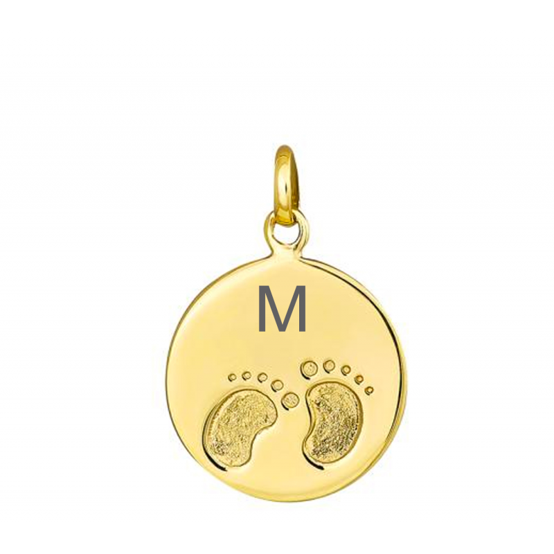 En flot 8 kt plade med små babyfødder som er aftrykt i guldet. Smykke pladen kan lasergraveres med din egen tekst, feks som minde om dit barn eller som mor / barn smykke. Teksten vil fremstå i let sort farve. Her kan alle skrifttyper anvendes. Der kan max være ca 15 tegn på smykket.