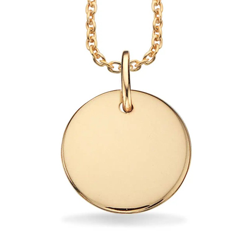 Vedhænget måler 10 mm og kan indgraveres med et enkelt tegn. Teksten vil blive ridset ned i metallet og fremstå i let sølv farve. Her er der plads til et enkelt tegn og både Us block eller Vanessa kan anvendes. Teksten bliver graverede midt i. Smykket leveres med 42 cm lang forgyldt kæde og er et meget enkelt og stilfuldt smykke. Leveres med kæde og i pæn æske, så det er lige til at give som gave.