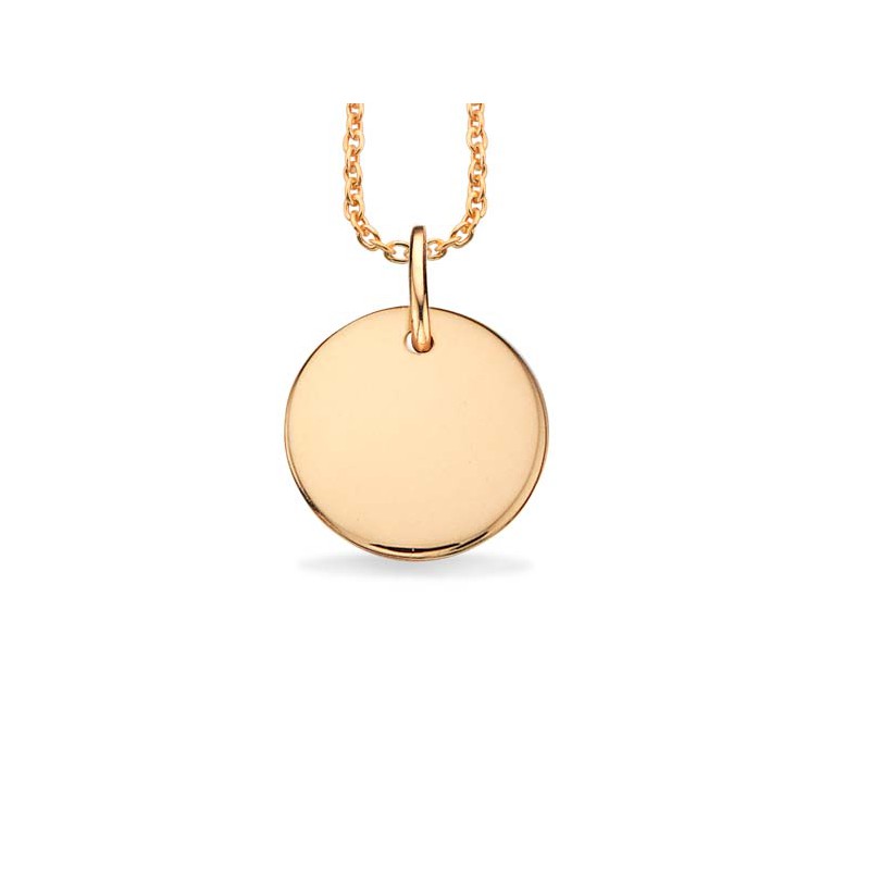 Vedhænget måler 13 mm og kan lasergraveres med op til 20 tegn fordelt på tre linjer på forsiden. Teksten vil fremstå i en let sølv farve. Smykket leveres med 42 cm lang forgyldt kæde og er et meget enkelt og stilfuldt smykke. Der er et lille stempel på bagsiden af vedhænget. Smykket leveres med kæde og i pæn æske, så det er lige til at give som gave.