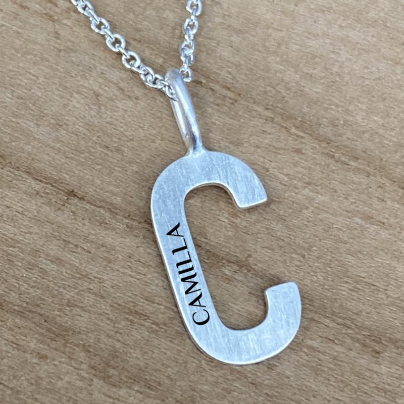 C bogstave i sølv er en enkelt og flot sølv bogstave vedhæng. Vedhænget kan lasergraves med egen tekst på siden og her kan der ca være 10 tegn. Teksten vil blive lasergraverede og fremstå i let sort farve. Her kan alle vores skrifttyper anvendes, men vores anbefaling er Ariel som bliver mest læseligt. C - vedhænget leveres med kæde i 42 cm og måler ca 15 mm i højde. Et flot smykke som leveres i smykkeæske så det er klar til at give som gave.