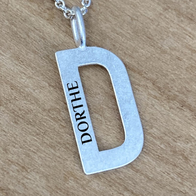D bogstave i sølv er en enkelt og flot sølv bogstave vedhæng. Vedhænget kan lasergraves med egen tekst på siden og her kan der ca være 10 tegn. Teksten vil blive lasergraverede og fremstå i let sort farve. Her kan alle vores skrifttyper anvendes, vi vil dog anbefaler Ariel, da den bliver mest læselig. D - vedhænget leveres med kæde i 42 cm og måler ca 15 mm i højden Et flot smykke som leveres i smykkeæske så det er klar til at give som gave.