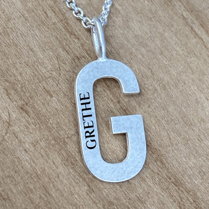 G bogstave i sølv er en enkelt og flot sølv bogstave vedhæng.Vedhænget kan lasergraves med egen tekst på siden og her kan der ca være 10 tegn. Teksten vil blive lasergraverede og fremstå i let sort farve. Her kan alle vores skrifttyper anvendes, dog vil vi anbefaler Ariel som bliver mest læseligt. G- vedhænget leveres med kæde i 42 cm og måler ca 15 mm i højden.Et flot smykke som leveres i smykkeæske så det er klar til at give som gave.
