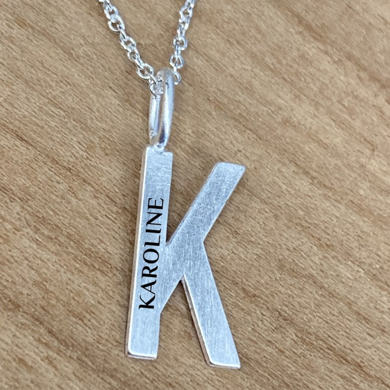 K bogstave i sølv er en enkelt og flot sølv bogstave vedhæng. Vedhænget kan lasergraves med egen tekst på siden og her kan der ca være 10 tegn. Teksten vil blive lasergraverede og fremstå i let sort farve. Her kan alle vores skrifttyper anvendes, dog vil vi anbefale Ariel, som bliver mest læselig.K- vedhænget leveres med kæde i 42 cm og måler 15 mm. Et flot smykke som leveres i smykkeæske så det er klar til at give som gave.