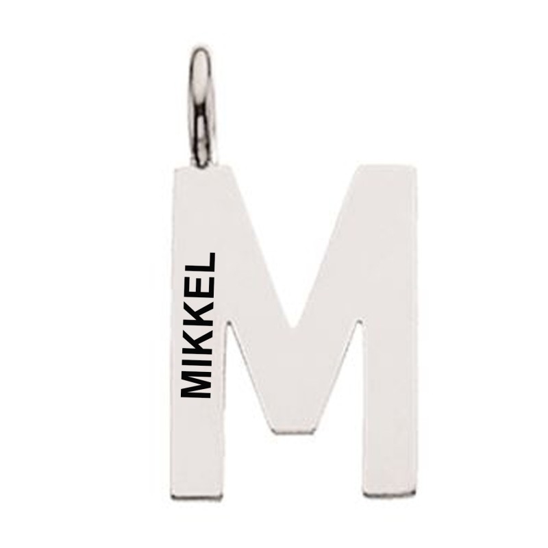 M bogstave i sølv er en enkelt og flot sølv bogstave vedhæng. Vedhænget kan lasergraves med egen tekst på siden og her kan der ca være 10 tegn. Teksten vil blive lasergraverede og fremstå i let sort farve. Her kan alle vores skrifttyper anvendes, dog anbefaler vi Ariel som bliver mest læselig.M- vedhænget leveres med kæde i 42 cm og 15 mm i højden Et flot smykke som leveres i smykkeæske så det er klar til at give som gave.