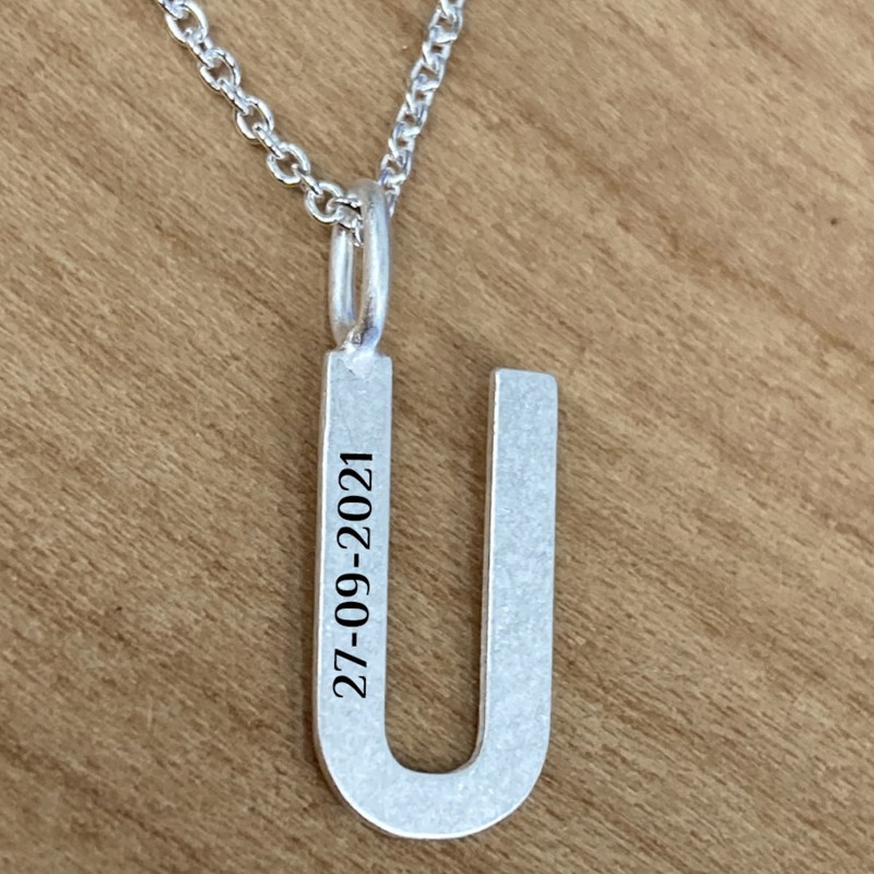 U bogstave i sølv er en enkelt og flot sølv bogstave vedhæng. Vedhænget kan lasergraves med egen tekst på siden og her kan der ca være 10 tegn. Teksten vil blive lasergraverede og fremstå i let sort farve. Her kan alle vores skrifttyper anvendes, dog anbefaler vi Ariel som bliver mest læselig. U- vedhænget leveres med kæde i 42 cm og måler 15 mm i højden.Et flot smykke som leveres i smykkeæske så det er klar til at give som gave.