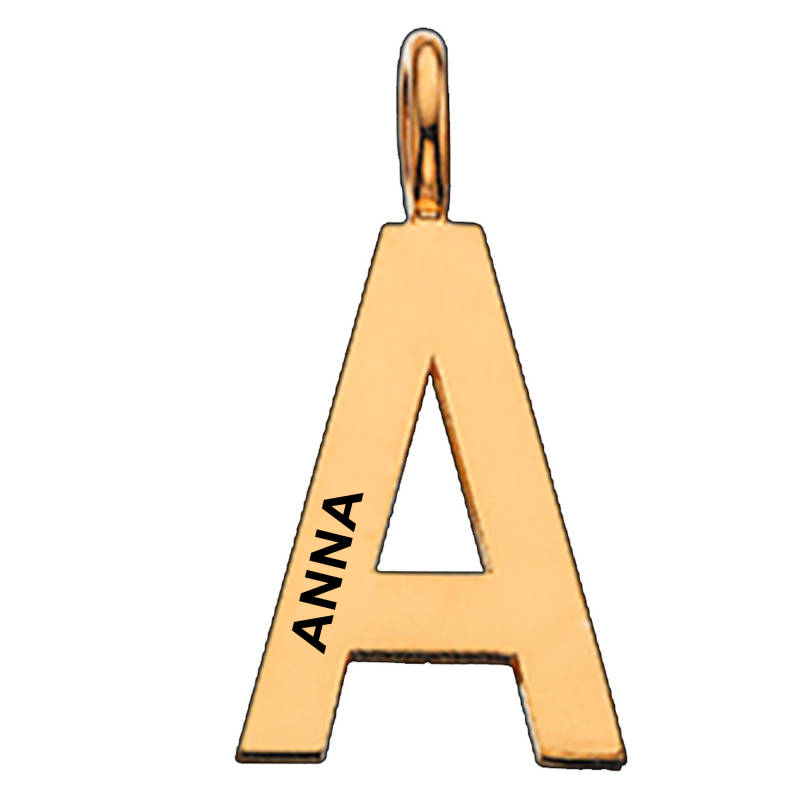 Et enkelt og flot bogstavs vedhæng i forgyldt sølv. A bogstavet kan lasergraveres med din egen tekst, på siden af A'et. Skriften vil fremstå i let sort farve og vi anbefaler ca 10 tegn på dette vedhæng. Her bliver Ariel mest læseligt. A vedhænget måler ca 15 mm i højden og leveres med 42 cm forgyldt kæde. Flot smykke vedhæng til en du holder af. Leveres i æske, så det er lige klar til at give som gave.