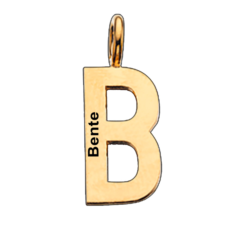 Et enkelt og flot bogstavs vedhæng i forgyldt sølv. B bogstavet kan lasergraveres med din egen tekst, på siden af B’et. Skriften vil fremstå i let sort farve og vi anbefaler ca. 10 tegn på dette vedhæng. Her bliver Ariel mest læseligt. B vedhænget måler ca. 15 mm i højden og leveres med 42 cm forgyldt kæde. Flot smykke vedhæng til en du holder af. Leveres i æske, så det er lige klar til at give som gave.