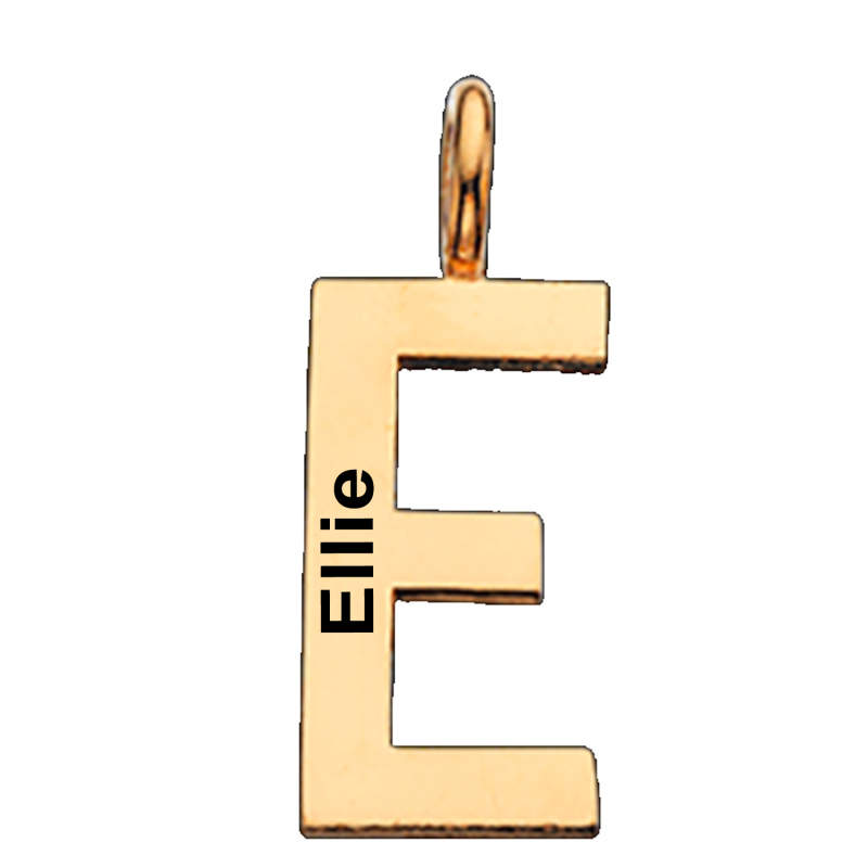 tlf. 20 33 76 60Et enkelt og flot bogstavs vedhæng i forgyldt sølv. E bogstavet kan lasergraveres med din egen tekst, på siden af E’et. Skriften vil fremstå i let sort farve og vi anbefaler ca. 10 tegn på dette vedhæng. Her bliver Ariel mest læseligt. E vedhænget måler ca. 15 mm i højden og leveres med 42 cm forgyldt kæde. Flot smykke vedhæng til en du holder af. Leveres i æske, så det er lige klar til at give som gave.