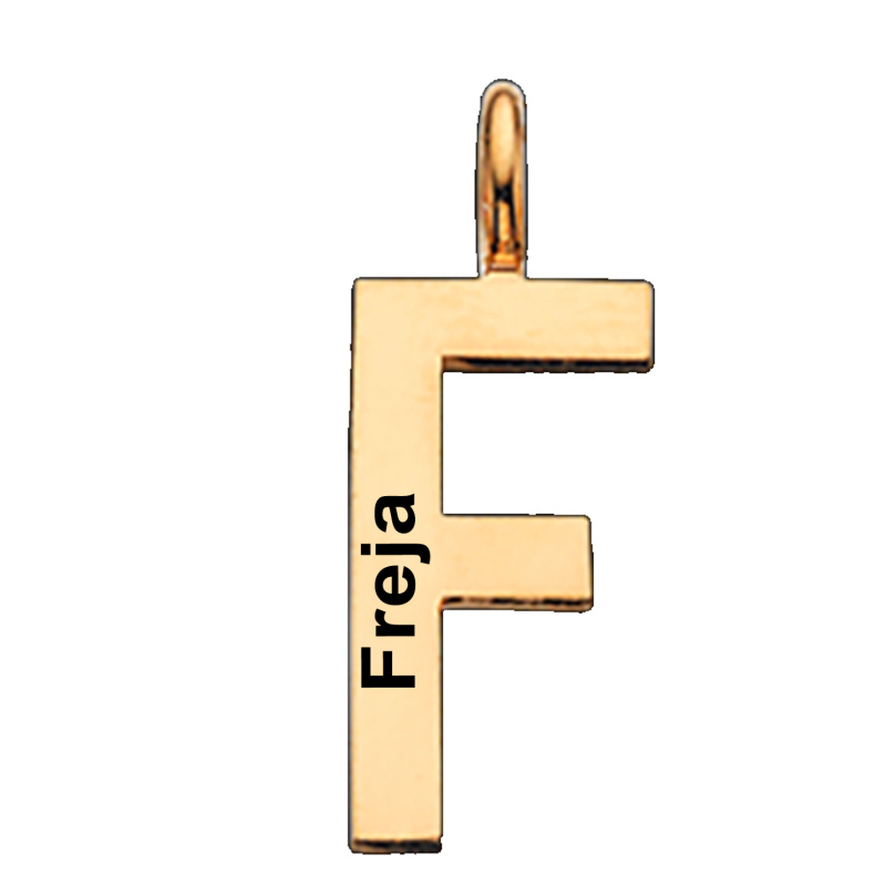 Et enkelt og flot bogstavs vedhæng i forgyldt sølv. F bogstavet kan lasergraveres med din egen tekst, på siden af F’et. Skriften vil fremstå i let sort farve og vi anbefaler ca. 10 tegn på dette vedhæng. Her bliver Ariel mest læseligt. F vedhænget måler ca. 15 mm i højden og leveres med 42 cm forgyldt kæde. Flot smykke vedhæng til en du holder af. Leveres i æske, så det er lige klar til at give som gave.